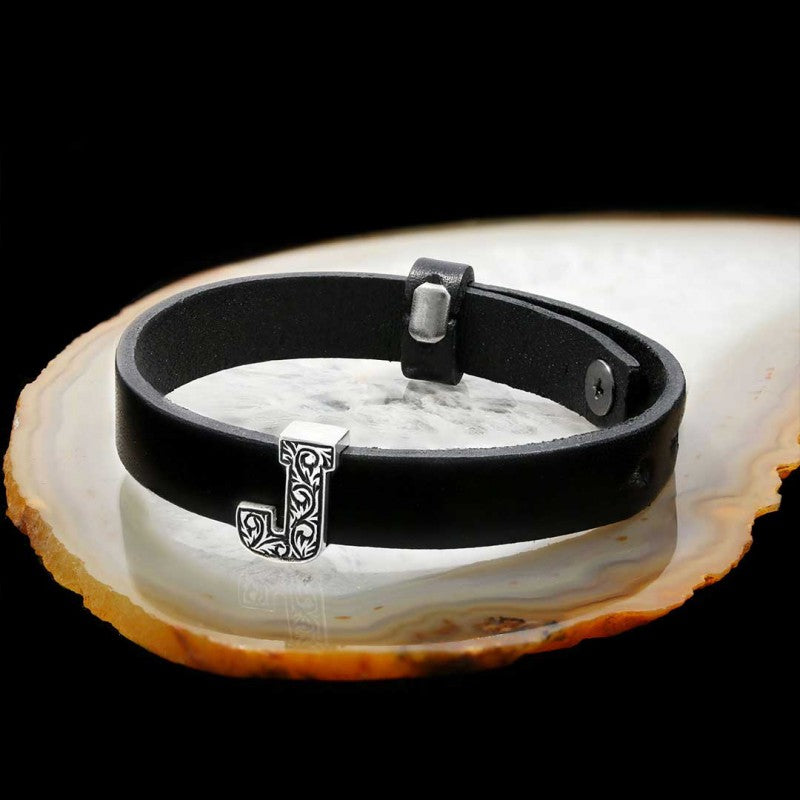 925 Sterling Silver Motif J Letter Leather Bracelet